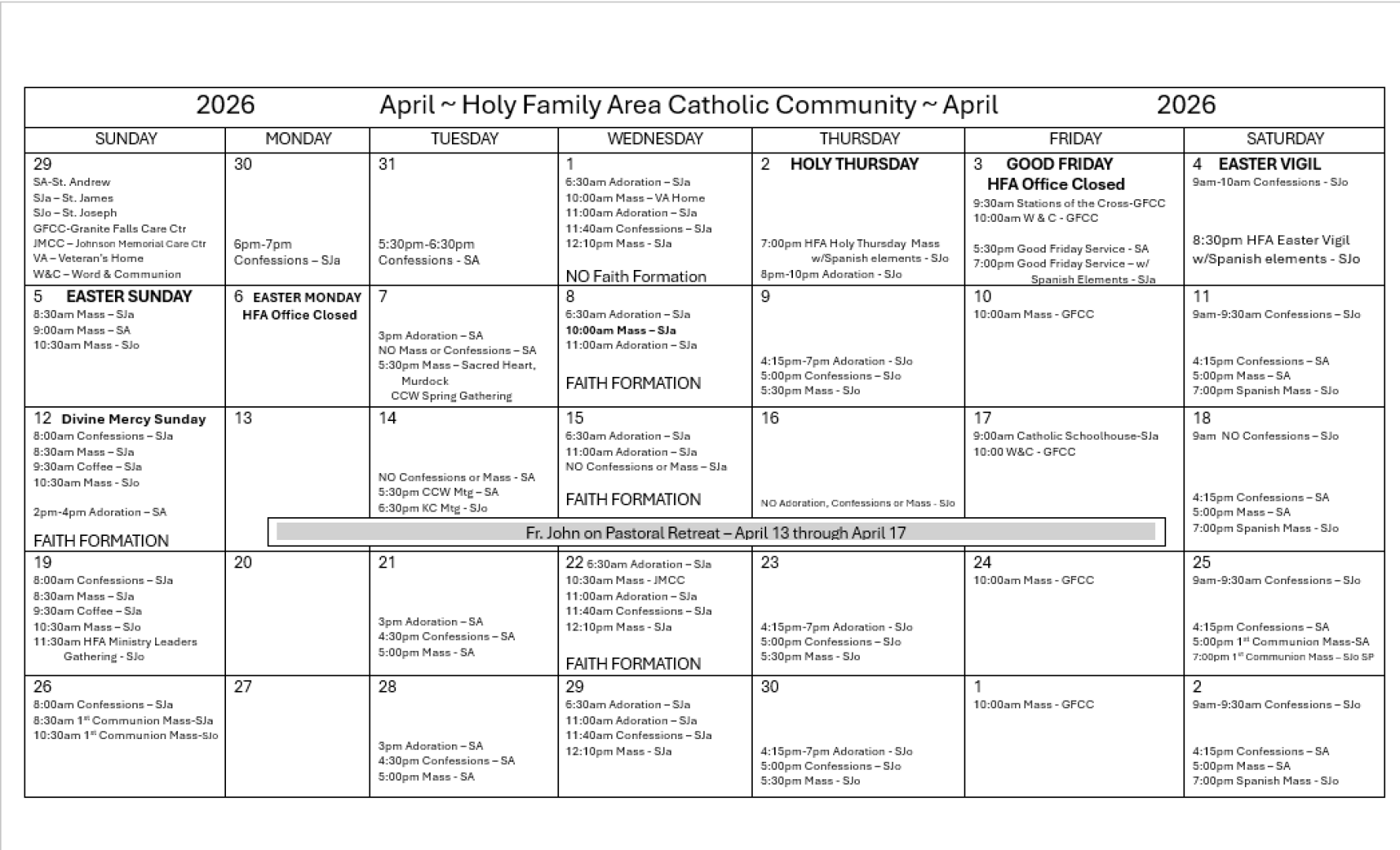 Saturdays: 4:20-4:40PM at St Andrew, Granite Falls